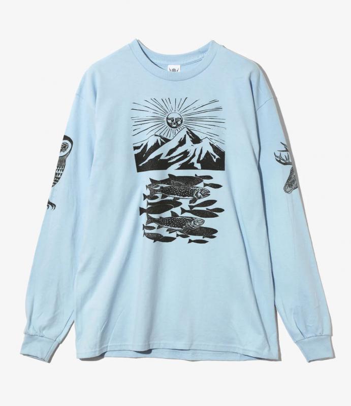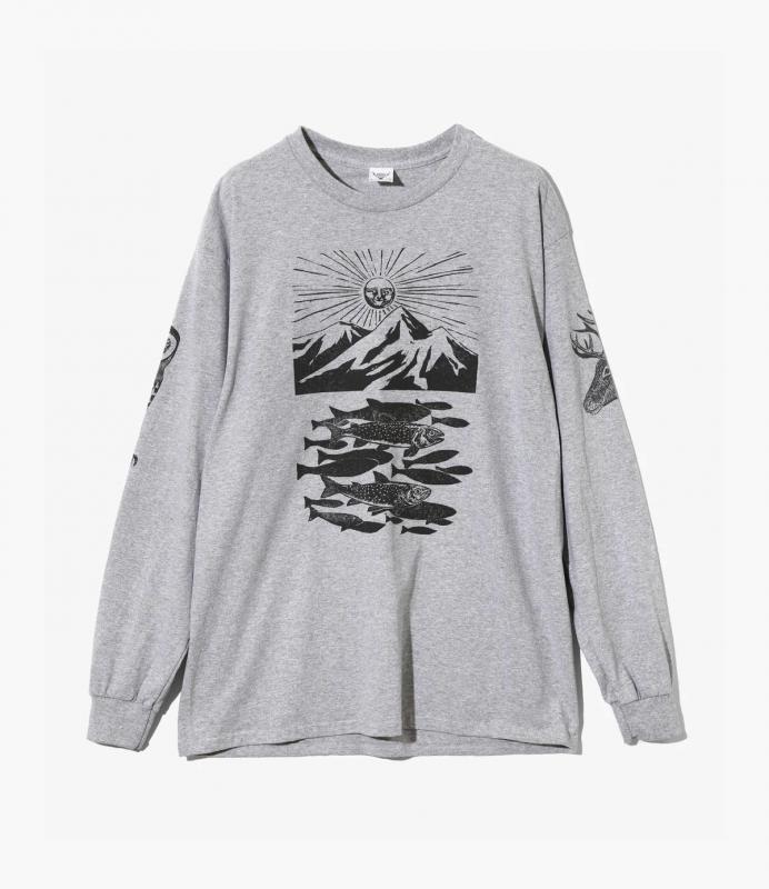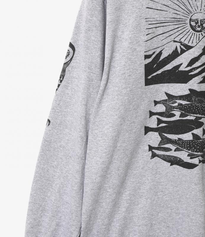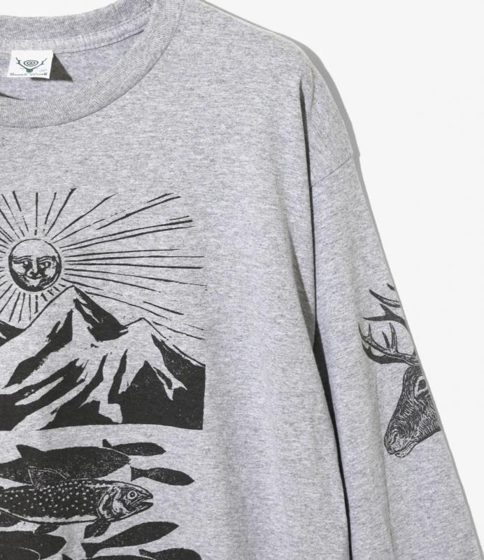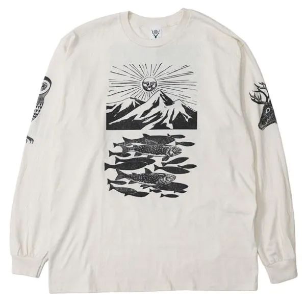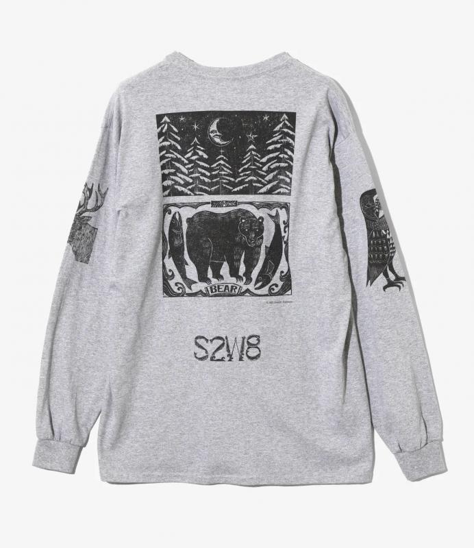 北海道の版画家・北村太氏と〈SOUTH2 WEST8〉によるコラボレーション。北海道の動植物やトラウト、名山などを題材にした版画アートをモノクロプリントで表現し、ユーモラスで緻密な世界観を落とし込みました。北村氏の視点で再解釈されたオリジナルロゴもポイント。スウェットパーカ、ロングスリーブTシャツ、グロッサリーバッグなど全6型で展開されます。