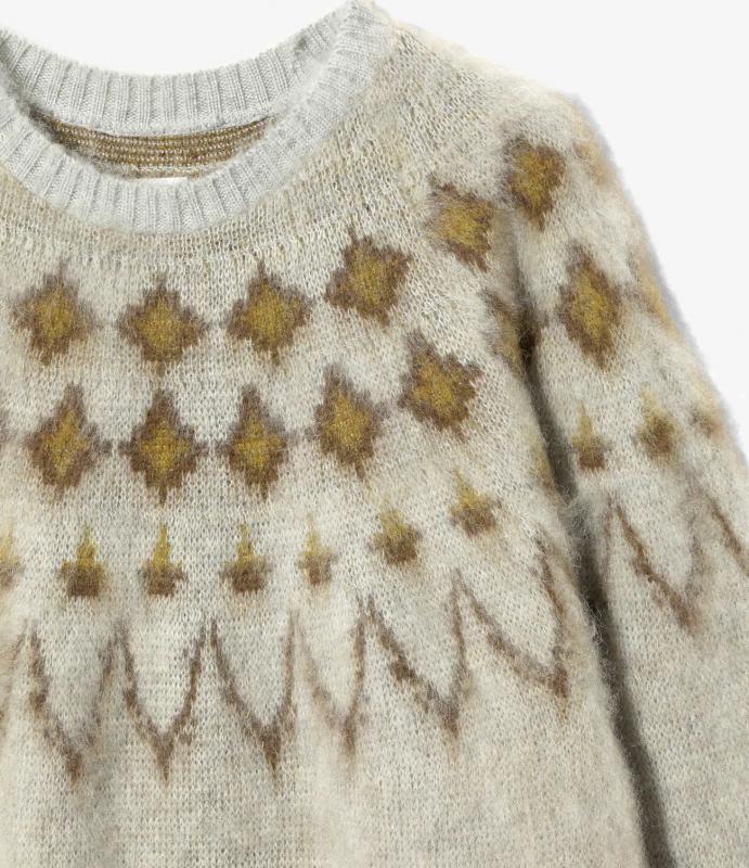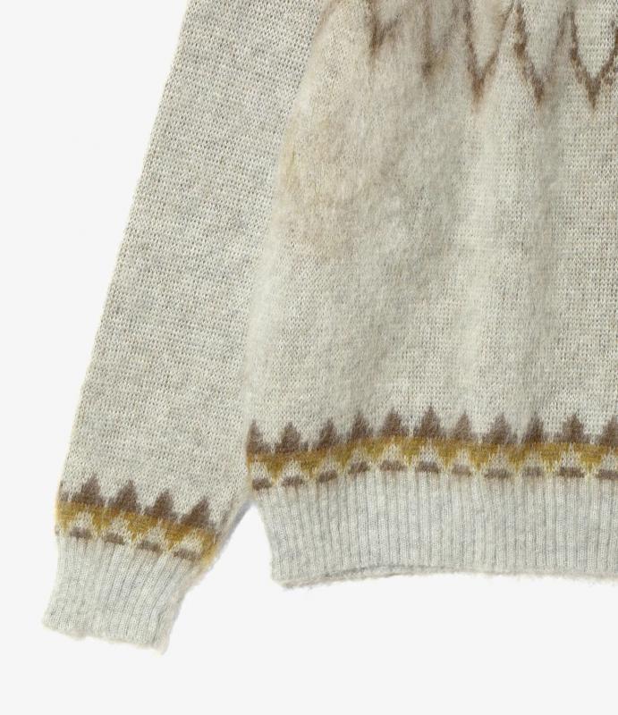 発色の良いモヘアで制作された、個性的なクルーネックセーターです。ニットの定番ノルディック柄に〈SOUTH2 WEST8〉らしいアレンジを加えたデザイン。空気を含む、軽快で保温性抜群のモヘア素材をたっぷりと使用した一着です。
