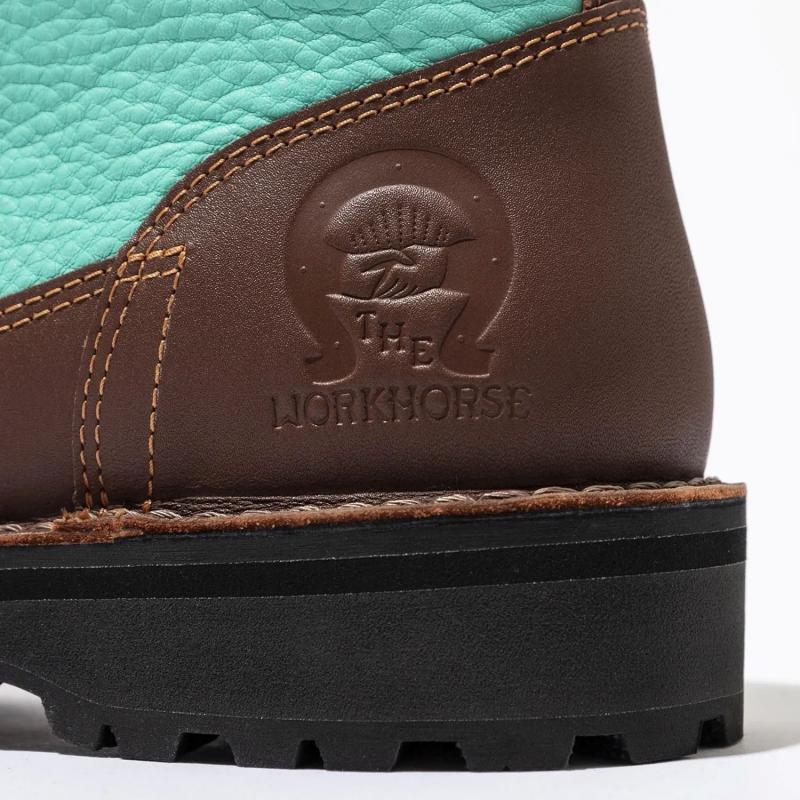 ポートランド近郊、タイガード出身のElliot Wescottは結婚を機に妻の故郷東京に移住、ヘヴィブルースバンド”KNOW YOUR MOUNTAIN”の元メンバーだが音楽活動からは距離を置きデザイナーとして生計を立てていた。2013年、休暇中に訪れた高尾山にて観光で来日していた元KYMのDoug Ellingtonと偶然の再会を果たす。これを機に元メンバーと連絡を取り合うようになり、音楽ファイルを介しての楽曲制作を再開したと言われている。学生時代、アウトドアストアの店員や常連客で結成、20代前半の若者達が奏でる、その年齢と容姿からは想像できない楽曲が話題となっていたKYM。2013年当時、30代となった元メンバーは東京、ポートランド、シカゴに在住し、デザイナー、靴職人、コーヒーロースター、バイクメカニック、主婦とそれぞれ別々の道を歩んでいた。2015年、バンド名を"THE WORKHORSE”として正式に活動を再開。バンド名はKYMのヒット曲”THE WORKHORSE”に由来する。活動再開後の音楽性は以前とは異なり、コーラスワークを基調とした浮遊感のあるサイケデリックな世界観が特徴。ライブ活動はポートランドと東京での夏季数回のみに限定されるものの、音源のリリースは活発に行っている。”Dogtooth RIdge(2016)”、”Mt.Tengu(2017)”、”Silver Falls(2018)”は必要最小限の機材を用いて各地でライブレコーディングされた3部作として評価が高い。毎夏のみ集まり、それ以外はそれぞれ別の仕事に従事しているのが心地よい距離感だ、とメンバーは口を揃える。ライブ出演時には皆ダナーのブーツを履いている事でも知られているが、結成のきっかけとなったアウトドアストアでお揃いのダナーブーツを購入した事に起因しているとされている(前述の”Dogtooth Ridge”に収録されている” Go Deer Diner with My Danner”で歌われている、遊びに行ったらみんなお揃いのダナーを履いていて恥ずかしかった、というエピソードは有名)。今回販売されるブーツは”Mt.Tengu”リリース時に作成、東京でのみ販売されたマーチャンダイズや関係者用に作成された”THE WORKHORSE exclusive(通称チョコミント)”の復刻版。メンバーのブーツに焼印されたバンド名や意図的に点けられたつま先のスクラッチが型押しや刺繍で再現されている。