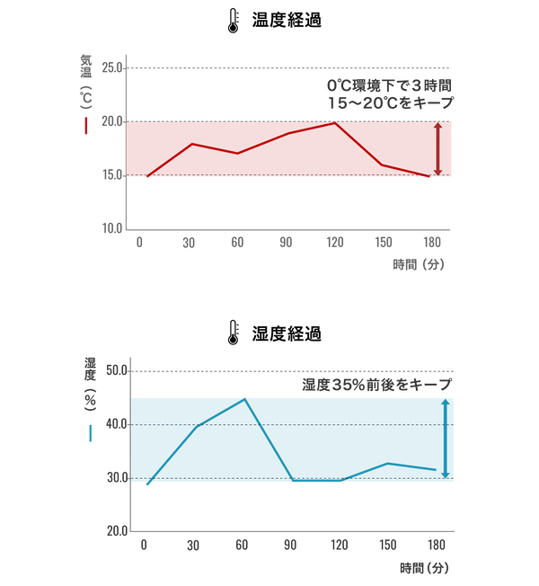 0℃の室温を維持した環境試験室内で、フリース上下を着用しLUGH (ルー)のLサイズを寝袋状にして使用。中に寝た状態で、ブランケット内部の温度・湿度を30分毎に計測しました。ブランケット内の温度は常に15℃前後、湿度は蒸れを感じない35%前後を維持。過酷な環境下でも寒さを感じることなく使用することができました。