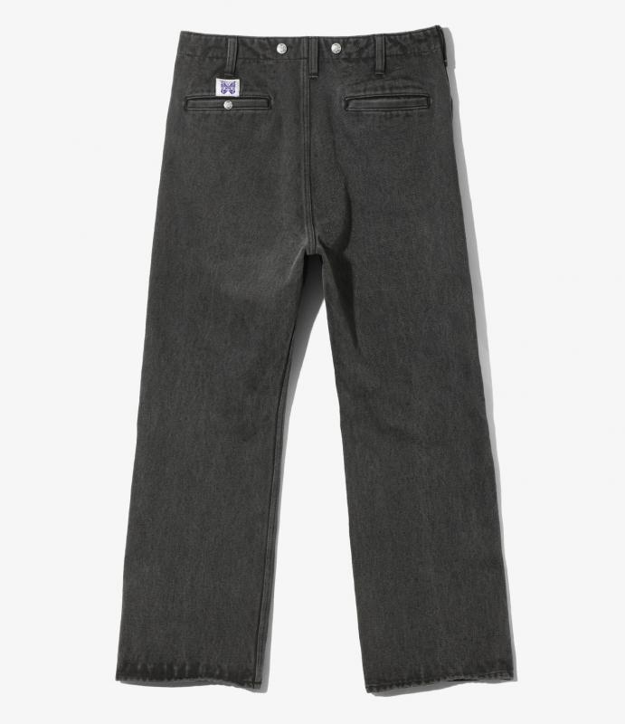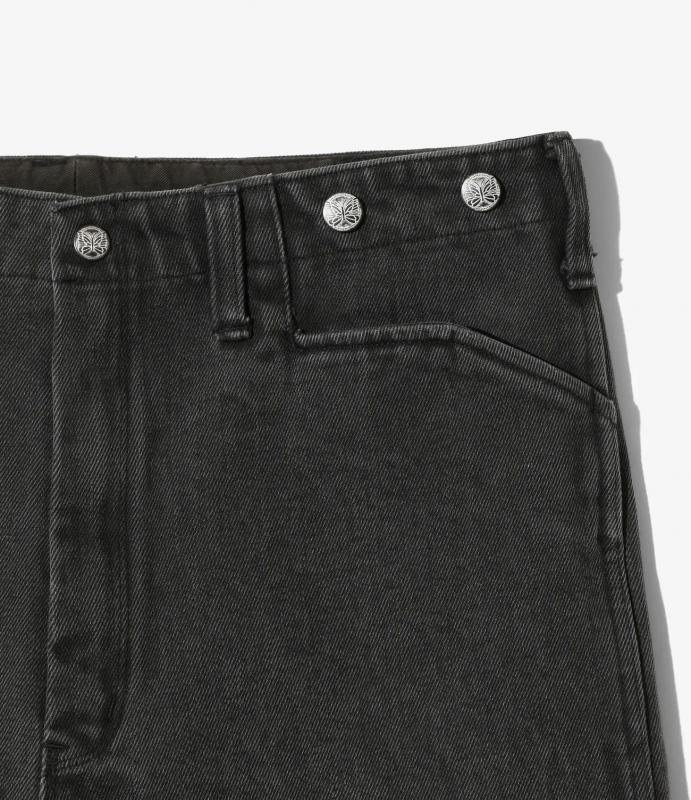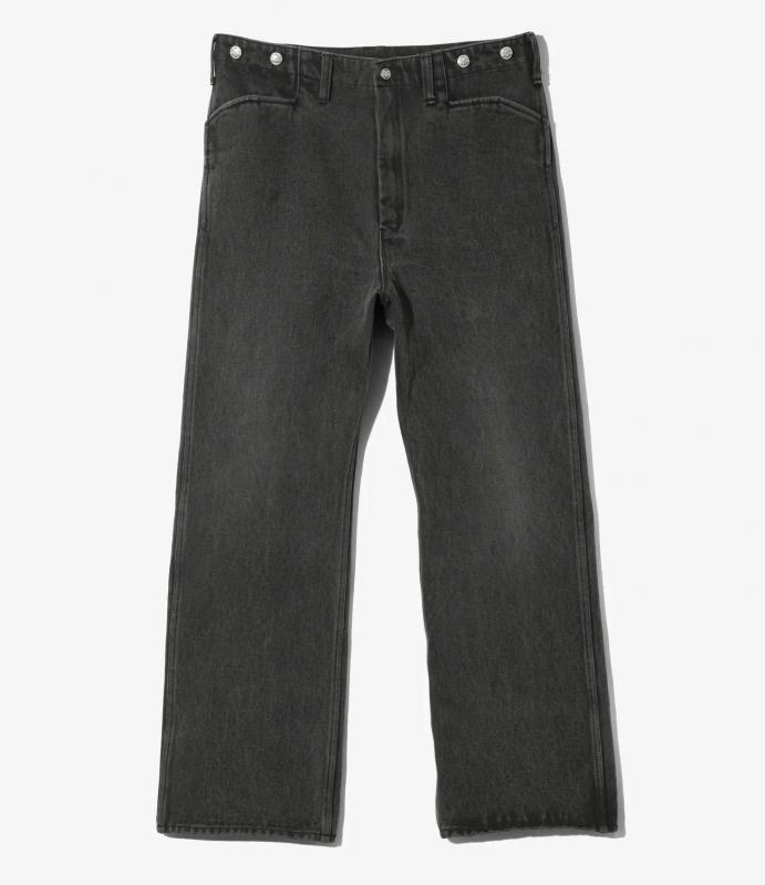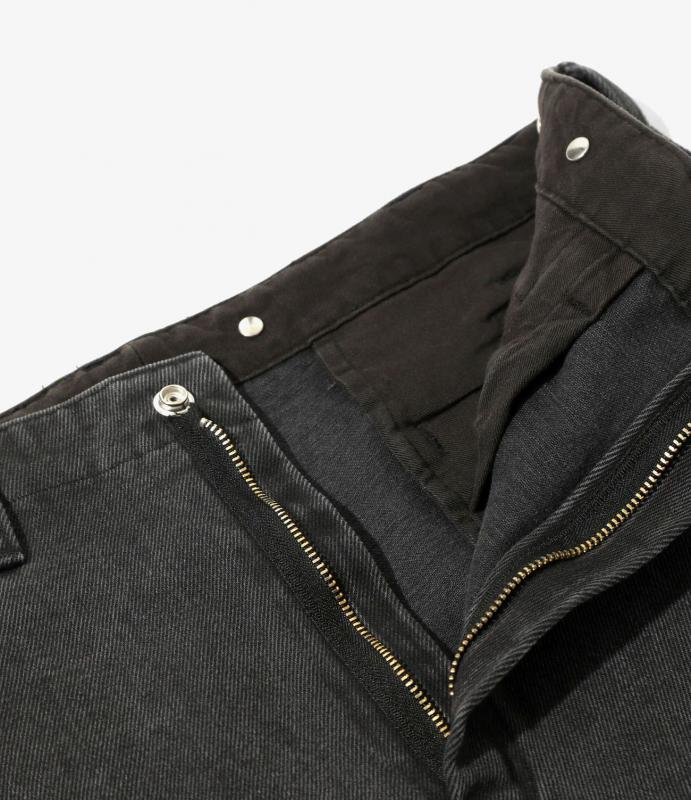 L型のフロントポケットや着脱が容易なスナップボタン、腰帯を無くしたワイドストレートのシルエットなどが特徴のフリスコパンツ。オーセンティックなヘビーツイル地にパピヨン(蝶)のスナップボタンが特徴的な一本です。同素材のカバーオールとセットアップでの着用も可能です。