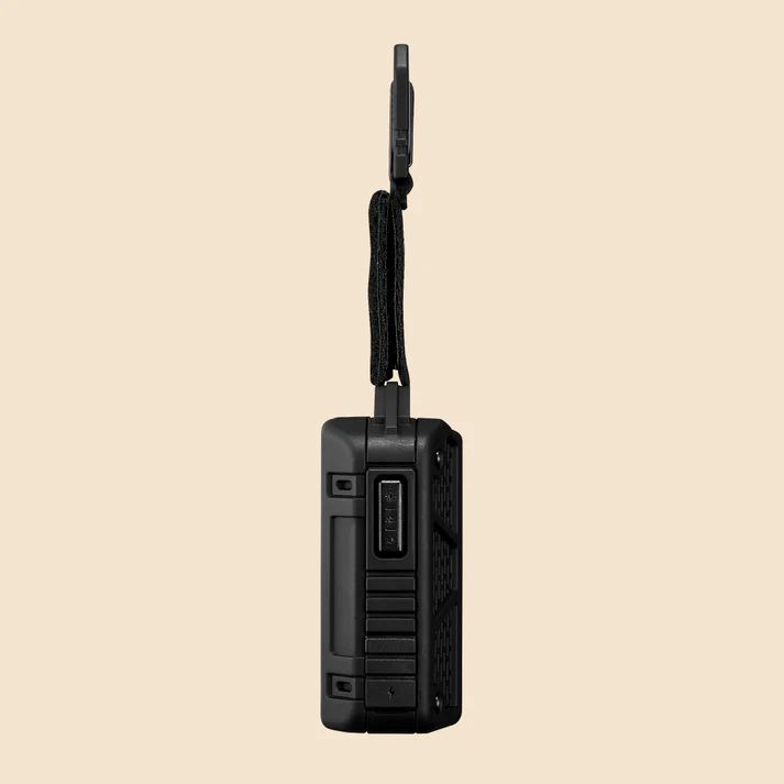 【 コンパクト&吊り下げ対応の設計】重量143.5g・サイズW68×D35×H86mm。付属のフック付きストラップで高所設置も簡単。