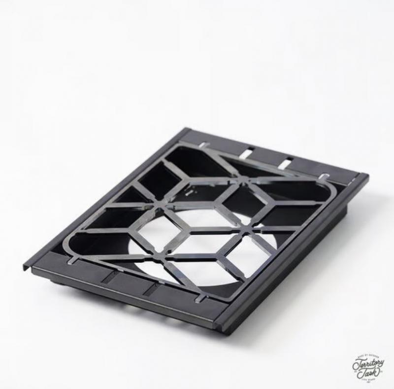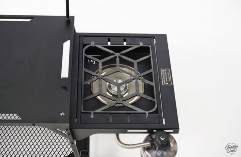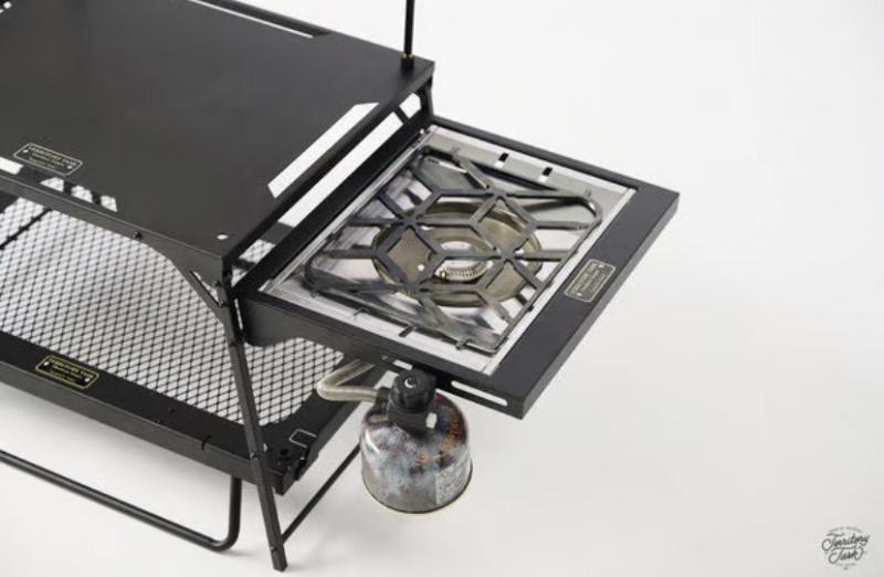 シンクインストーブフレームは、シンプルなスタイルと工業的な雰囲気を持つブラックデザインを特徴としています。このストーブフレームはSnow Peak製のストーブにも対応しており、汎用性が高いです。