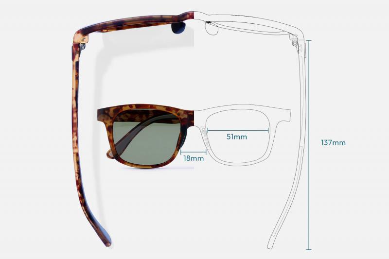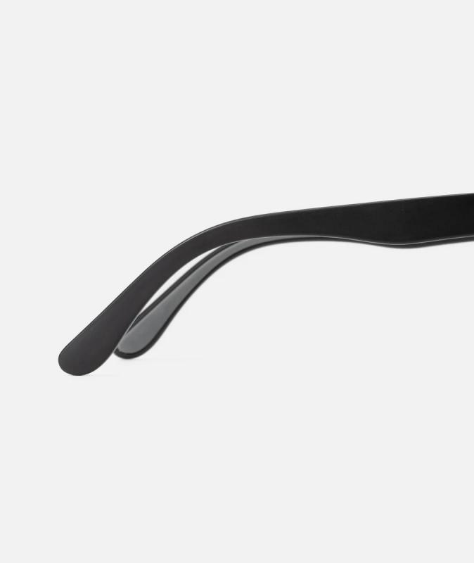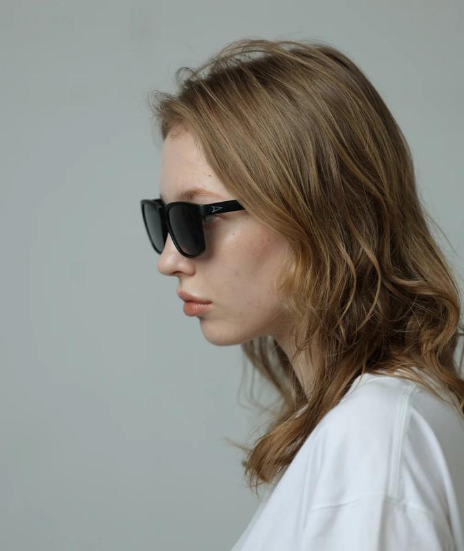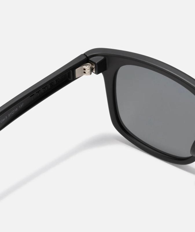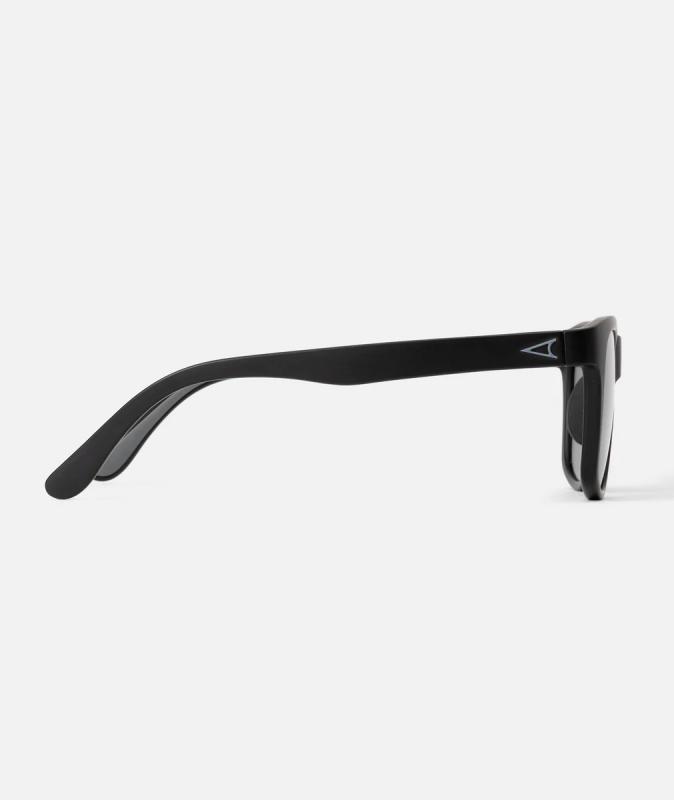 サングラスの定番、ウェリントンタイプのシェイプ。しっかりとしたサイズ感とボリューム感を持ちながら、全体のシルエットはスマートで力強い印象に仕上げられています。フレームはマットブラック、レンズは反射光をカットし視界をクリアに見やすくする偏光レンズ。