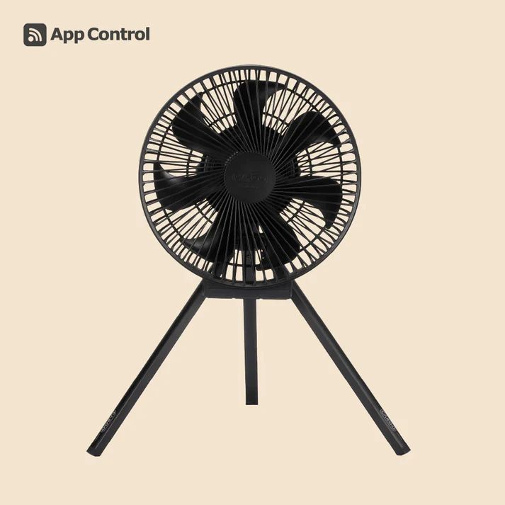 本体は完全ワイヤレス設計で、専用アプリを使えばスマートフォンから遠隔操作が可能。角度調整や風量切替も手元で簡単です ・