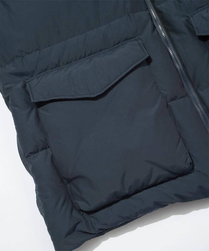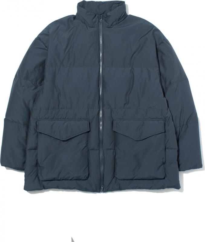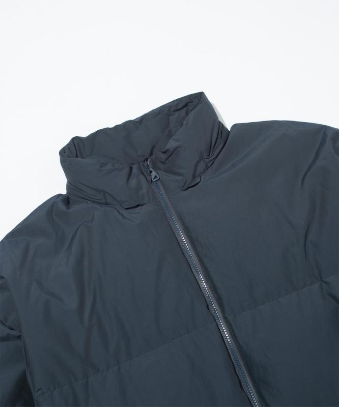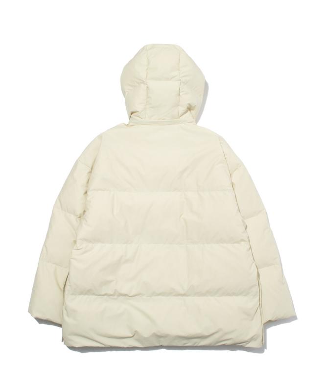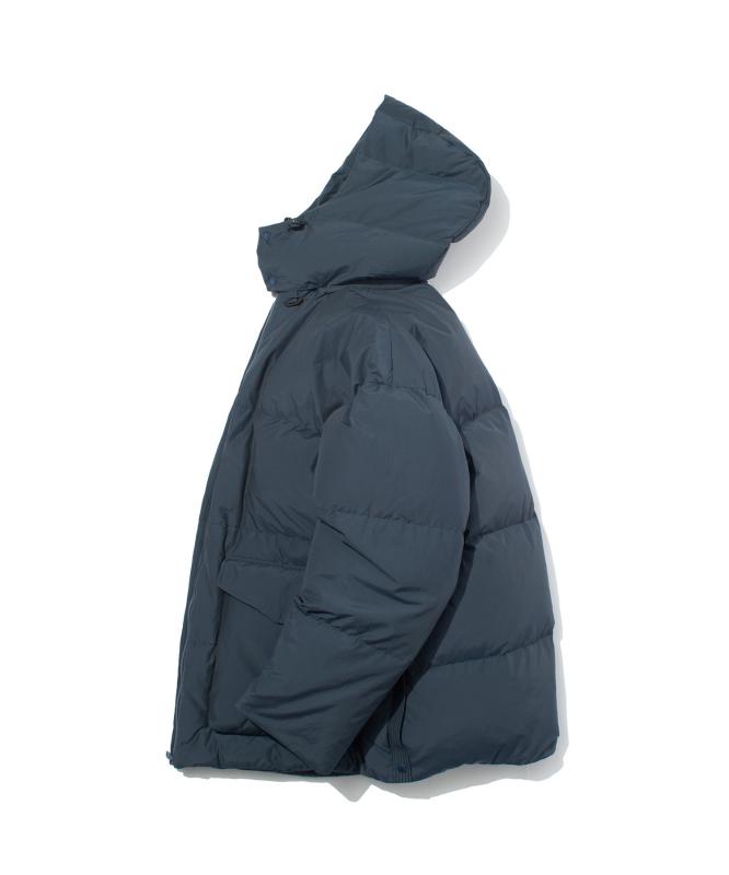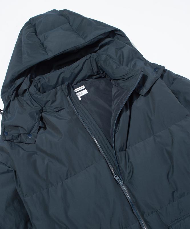 ジャケットや寝袋、布団から羽毛を回収し、丁寧に再洗浄された650フィルパワーのダウン、素材はリサイクルナイロンを使用した、ダウンフードブルゾン。