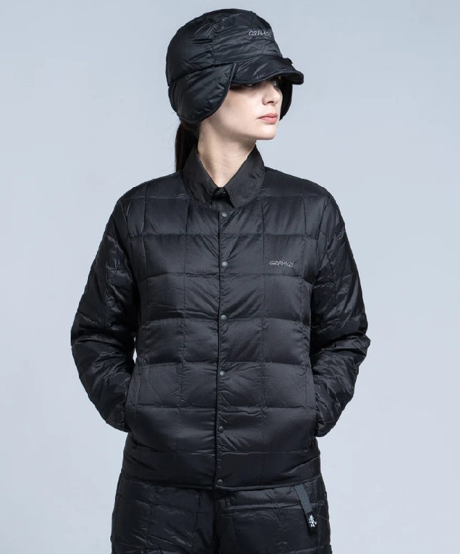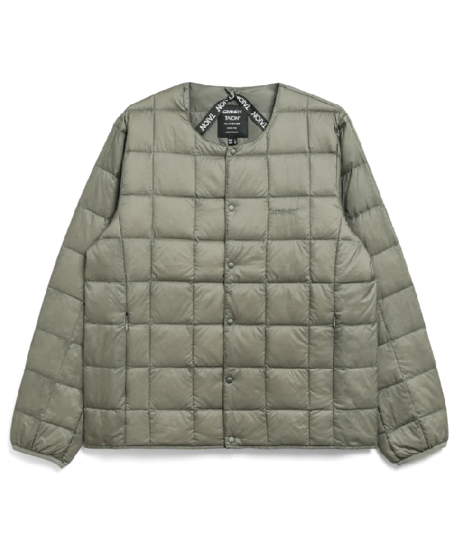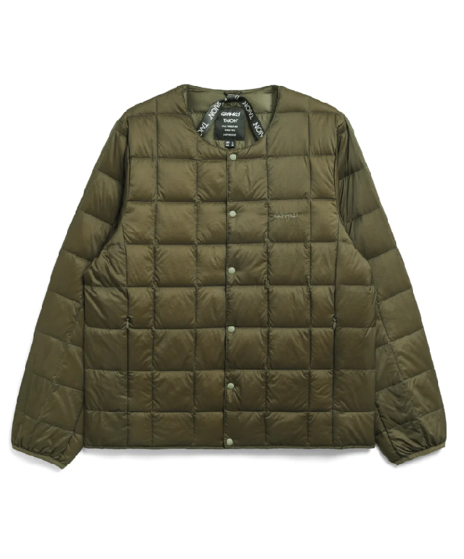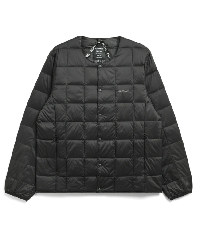 左胸の"GRAMICCI"刺繍がアクセントになった"GRAMICCI×TAION"のダウンジャケットです。