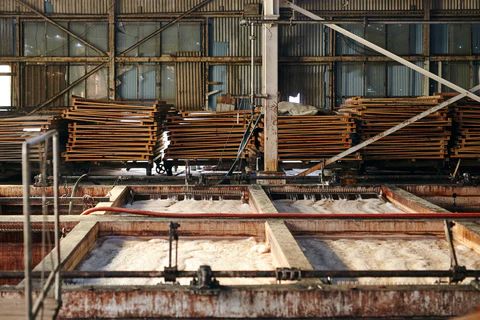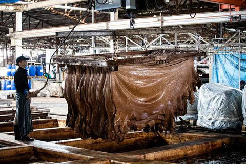 山陽さんのフルベジタブルタンニンレザーは、約1カ月もの間タンニン液が入ったプール「ピット槽」に漬けこまれ、ゆっくりと鞣されていきます。