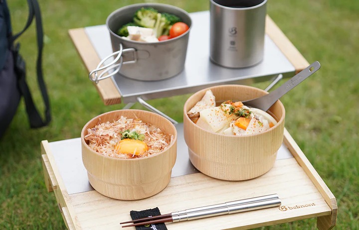 職人の技術により薄く削られ軽量で、抗菌作用のあるウレタン塗装を施してあります。スタッキングに優れているのでシェラカップやクッカーの隙間に収まります。
