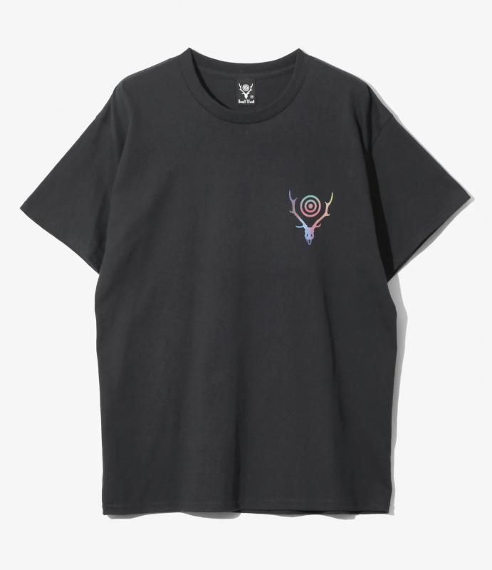 シンプルなボディに印象的なプリントをあしらった、〈SOUTH2 WEST8〉定番のTシャツが登場。フロント左胸にはディアスカルとターゲットマークのアイコンが、バックには大胆にサークルホーンのプリントが施されています。よりアクティブな着こなしやレイヤードスタイルにもフィットする一枚です。