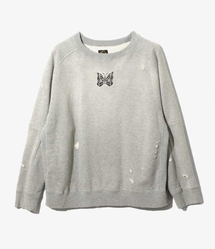 ヴィンテージスウェットのようなリアルなダメージや色褪せの加工が施されたスウェットシャツ。
