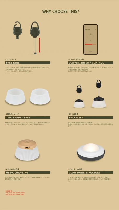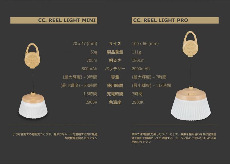 CC. REEL LIGHT REELLIGHTは、コンパクトなボディに高出力性能を凝縮したプレミアムランタンです。 独自開発のフリーリール構造により、高さを0~58cmまで自由に調整可能。