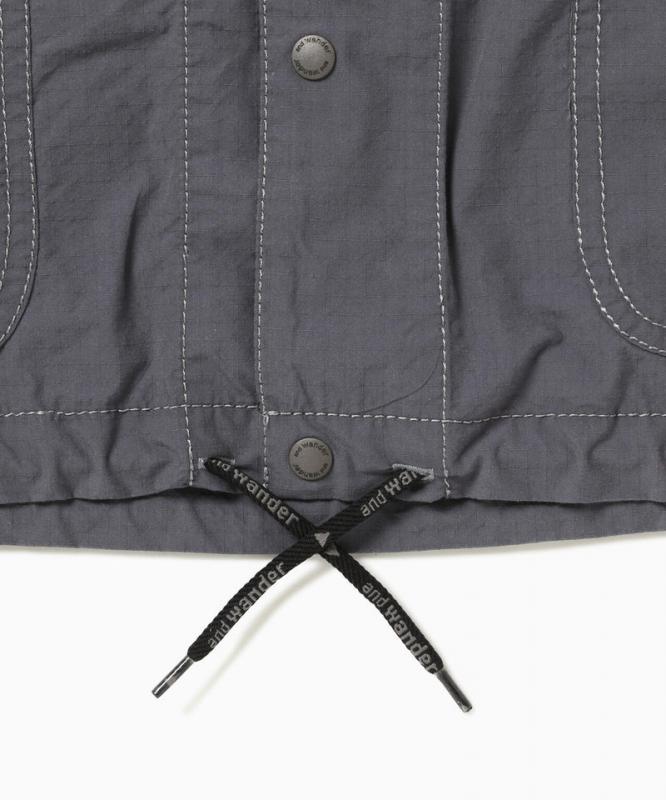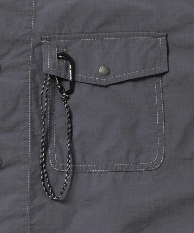 縦糸にオーガニックコットン、横糸に耐久性にすぐれたCORDURAナイロン糸を使用したrip stop素材です。部分的にリフレクターステッチを使用しています。ザックを背負った時に干渉しない位置にポケットが付き、フラップにはカラビナがついています。8番手の太い糸で縫製することで、パッカリングがでて独特の表情をつくります。