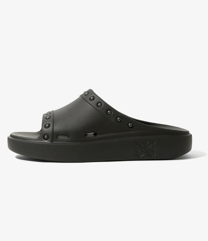 通気性に優れ、足先に開放感をもたらすオープントウ仕様。〈PPACO〉の代表作「LUX-2」をベースに、ソールに厚みを加えてクッション性を向上させ、快適な履き心地に仕上げました。素材には軽量で弾力性のある「High-PerFORM®」を採用し、足への負担を軽減。カラーはパープルとブラックの2色、パピヨンのロゴが映えるミニマルモデルと、スタッズでアクセントを効かせたモデルの2型を展開しています。