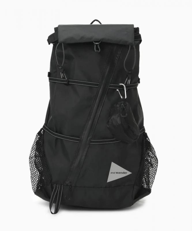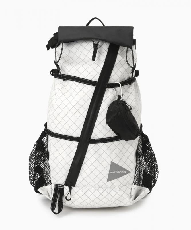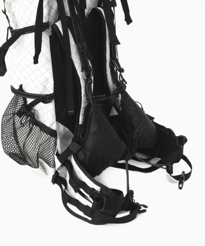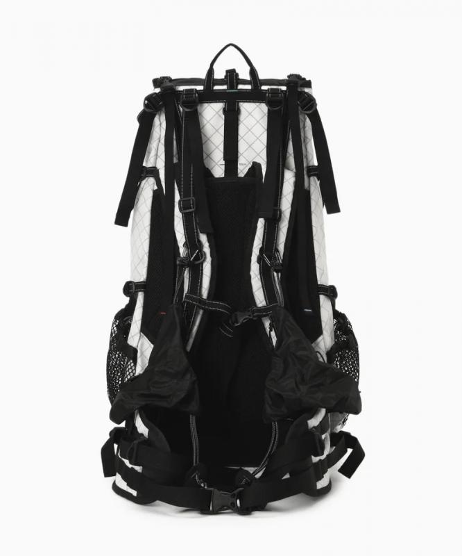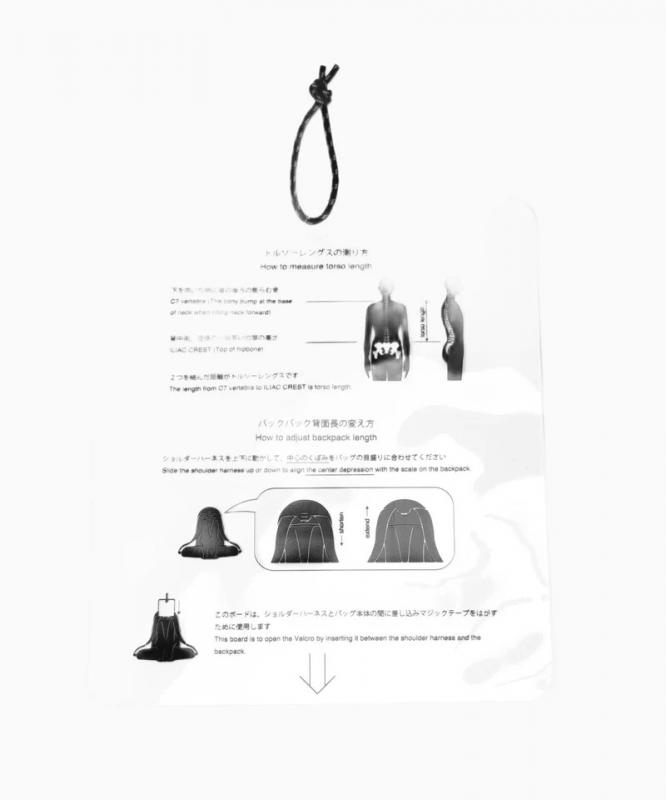 本体に使用しているECOPAK生地は、100%リサイクルポリエステル素材を使用した環境負荷の少ない素材です。INVISTA社のシリコンコーティングされたCORDURAナイロン素材を組み合わせています。背負ったまま小物の出し入れが可能なように、ポケット機能をフロントへ集結させたレイアウトにしています。雨蓋はフロントバッグにしてマップポケットとしても使用可能です。背面長を調整して、肩と腰で荷重を分散させて背負うことができます。実測容量37-42L、雨蓋2L