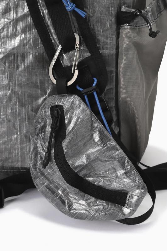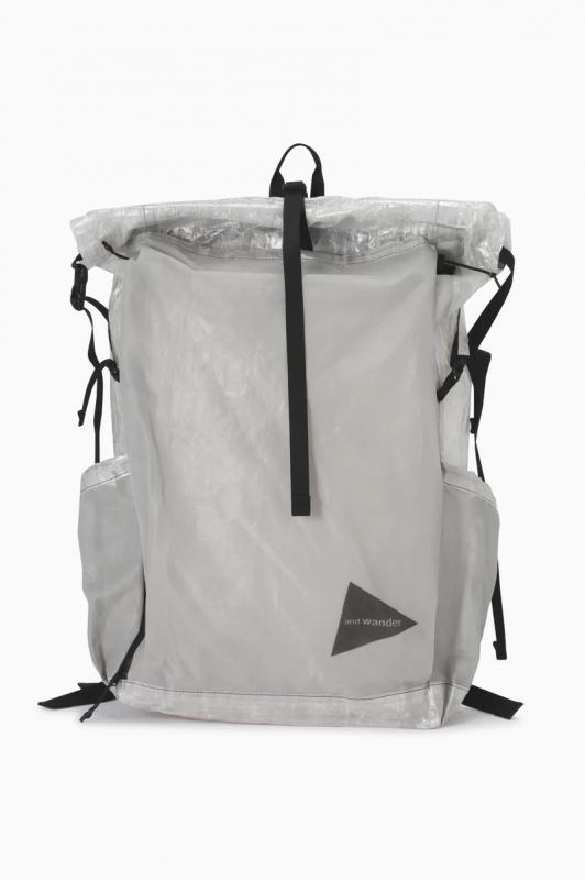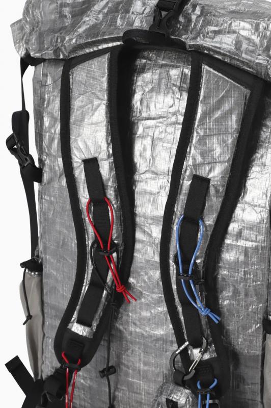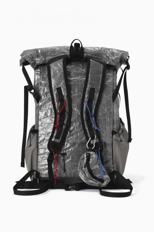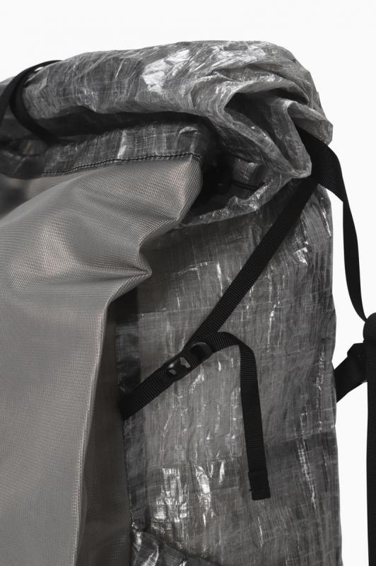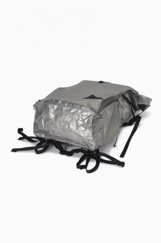 DSM社のダイニーマコンポジットファブリック(旧キューベン・ファイバー)を使用したバックパックです。ダイニーマ繊維をUV樹脂でラミネートしたフィルム状のダイニーマコンポジットファブリックは、レーシングボート用の高機能セイルなどに使用されていて、超軽量で高い防水性と引裂強度があります。このバックパックは軽量性を優先して作っているため、一点に集中した力が掛かると穴が空く等の破損する恐れがあります。フロントポケット脇のファスナーで内側にアクセスして荷物を取り出すことができます。実測容量25-32L